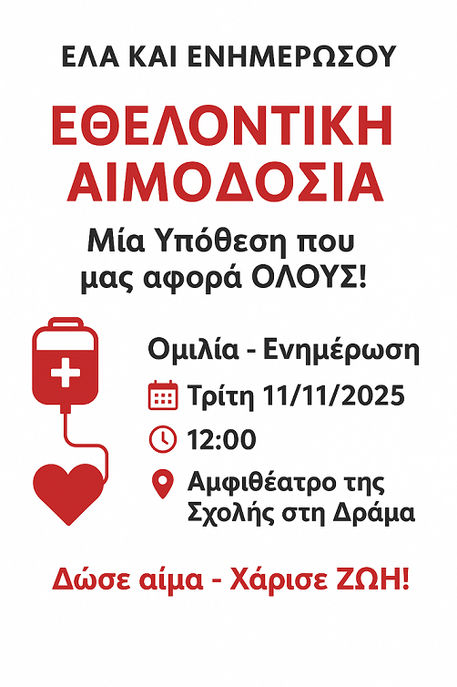 Ενημερωτική Ομιλία με θέμα “Εθελοντική Αιμοδοσία – Μία Υπόθεση που μας αφορά ΟΛΟΥΣ!” – Τρίτη 11.11.2025 ώρα 12:00, Κεντρικό Αμφιθέατρο Πανεπιστημιούπολης ΔΠΘ (Δράμα)