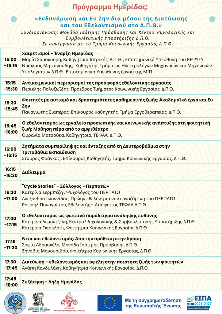 Ημερίδα «Ενδυνάμωση και Ευ Ζην δια μέσου της Δικτύωσης και του Εθελοντισμού στο Δ.Π.Θ., Τετάρτη 12 Νοεμβρίου 2025, και ώρα 15:00–18:00 Η ημερίδα θα είναι διαθέσιμη και για εξ αποστάσεως παρακολούθηση μέσω ζωντανής μετάδοσης στο YouTube.