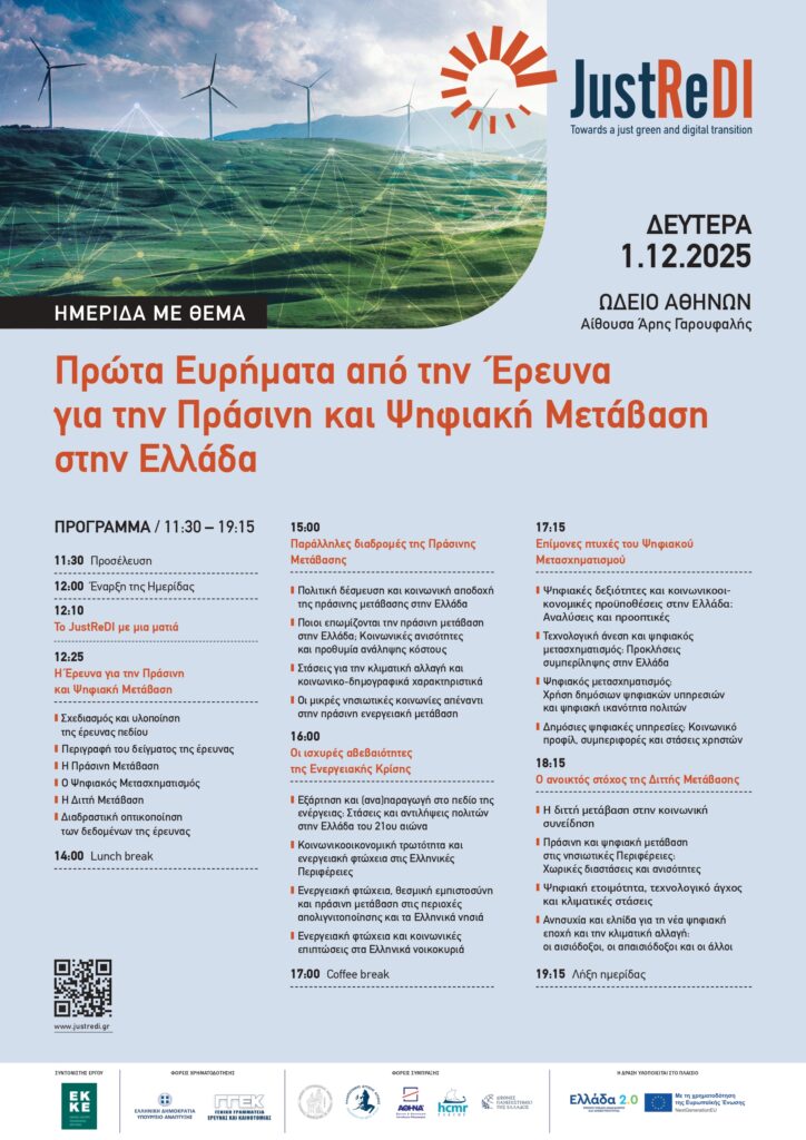 Ημερίδα με θέμα «Πρώτα Ευρήματα από την Έρευνα γιατην Πράσινη και Ψηφιακή Μετάβαση στην Ελλάδα» ΔΕΥΤΕΡΑ 1.12.2025, ΩΔΕΊΟ ΑΘΗΝΏΝ Αίθουσα Άρης Γαρουφαλής Δελτίο Τύπου Πρόγραμμα Ημερίδας