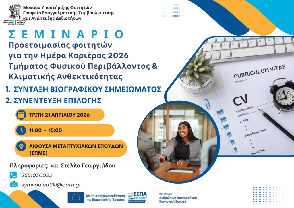 Την Τρίτη 21/04/2026 και ώρα 11:00–15:00, στην Αίθουσα μεταπτυχιακών σπουδών (ΕΠΜΣ) του Τμήματος Φυσικού Περιβάλλοντος και Κλιματικής Ανθεκτικότητας, θα πραγματοποιηθούν δύο σεμινάρια: